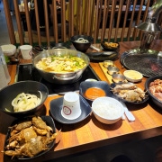 야채뿐만 아니라 고기에 곁들이는 반찬, 샤브샤브에 누운 만두 수제비 칼국수까지 다양하며 간장게장에 상무까지 알차게 준비되어 있습니다.